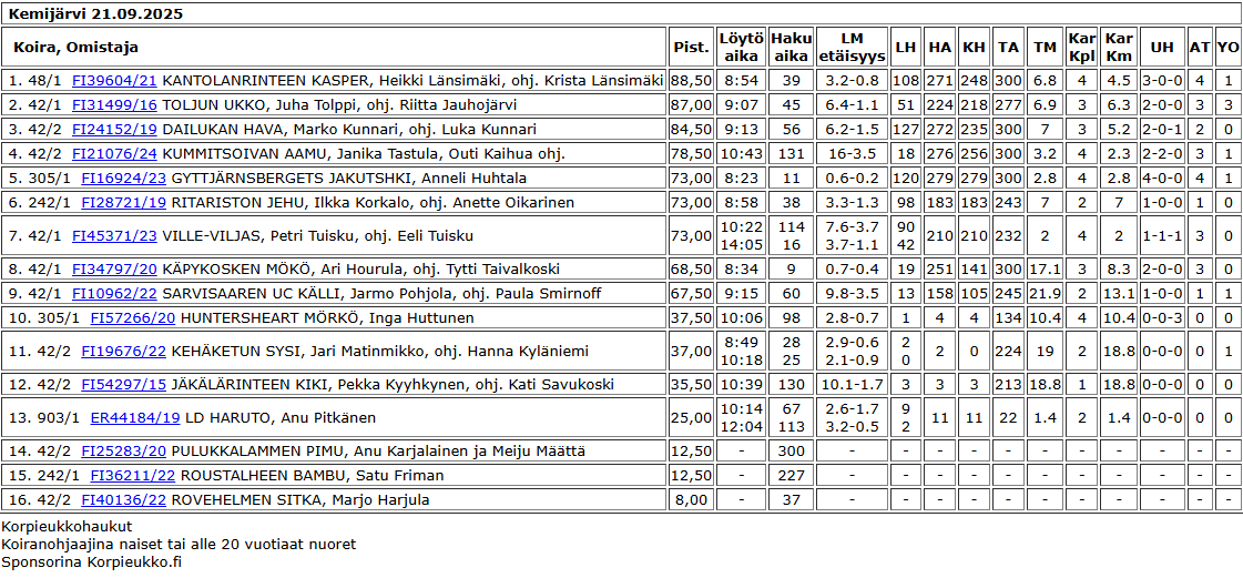- Kokeessa koiria ohjasivat leidit ja enintään 20- vuotiaat nuoret. Kokeessa oli mukana 16 koiraa, 14 leidiä ja kaksi alle 20 vuotiasta nuorta.